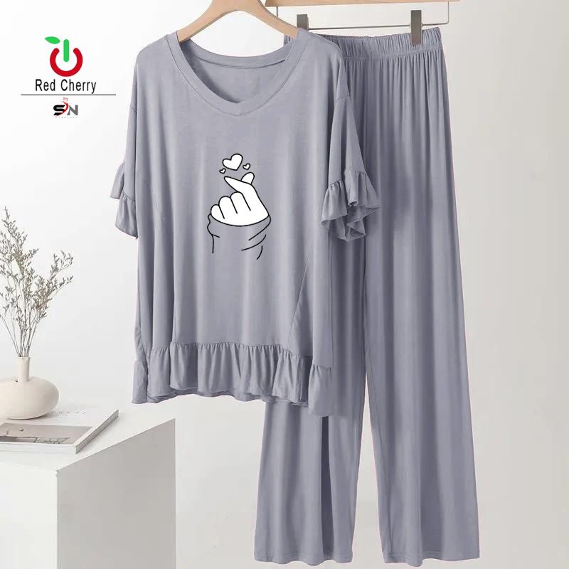 Plain Grey with Pink Lace V Neck with Palazzo Pajama Full Sleeves
